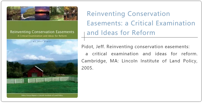 这一政策聚焦报告中,作者Jeff Pidot围绕保护地役权提出了如下两个问题:越来越多无人监管的土地信托和保护地役权是否对未来发展有利?何种改革更有助于提高保护地役权的可信度?该报告的出发点是引发社会对保护地役权的批判性讨论,而不是单纯提出具体解决方案。报告还指出,保护地役权需要放在长期的时间维度内进行评价和管理,否则我们给后代留下的可能是法律乱象和受损的公共利益。