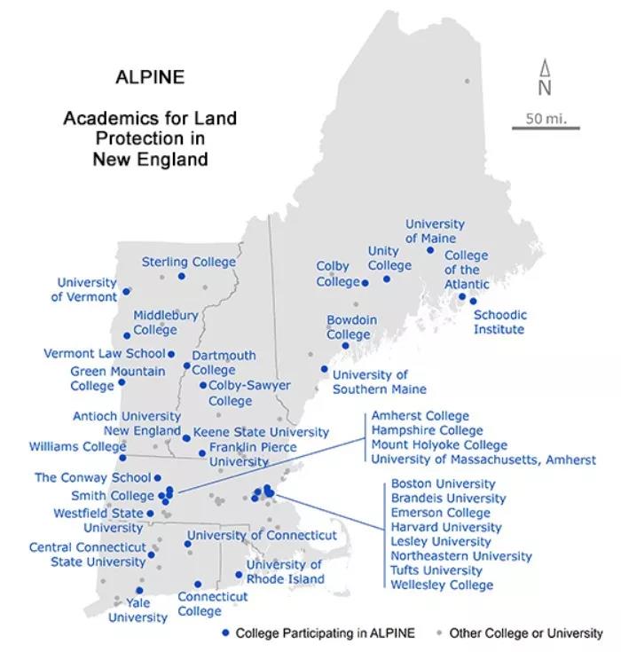 目前,新英格兰土地保护学会正在和区域保护伙伴关系(Regional Conservation Partnerships, RCPs)开展合作,该合作的一项成果就是建立学生在土地保护实习方面的数据库,从而更有助于分享和强化该领域的实践经验。同时,学会还正在建立一个新英格兰学术机构数据库以及土地保护与管理案例库。此外,学会也在争取在大学和学院的环境排名系统中纳入土地管理与保护这一指标。下图展示的是与新英格兰土地保护学会开展合作的地区高校。