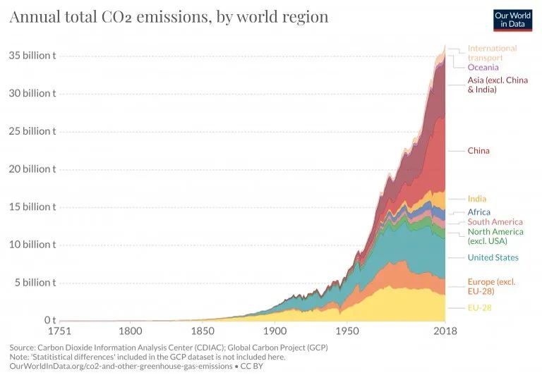 2018年全球二氧化碳排放量达到360亿吨,这是根据生产和增长层面计算出来的。在70年代全球二氧化碳排放量是140亿吨,比现在要低很多。