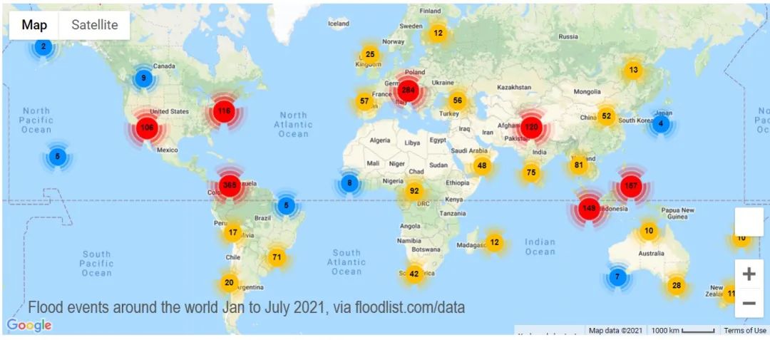 今年夏天气候灾害频发,覆盖范围也很广。今年7月份,洪水和飓风灾害基本上覆盖了全球(图2)。联合国政府间气候变化专门委员会(IPCC)发布的气候变化报告也提到了这些问题,我们必须预防气候变化演变成更大的灾难。