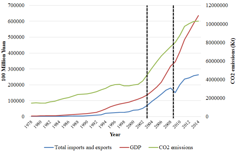 2002年是中国加入世界贸易组织后的第一年。自由贸易使得中国能够利用竞争优势从世界市场中受益。环境要素是中国的竞争优势之一,支持了中国经济的增长。图2展示的是中国1978年至2014年的贸易额、GDP和二氧化碳排放量。2002年至2008年,贸易额、GDP和二氧化碳排放量同步增长,表明这三者相关联。