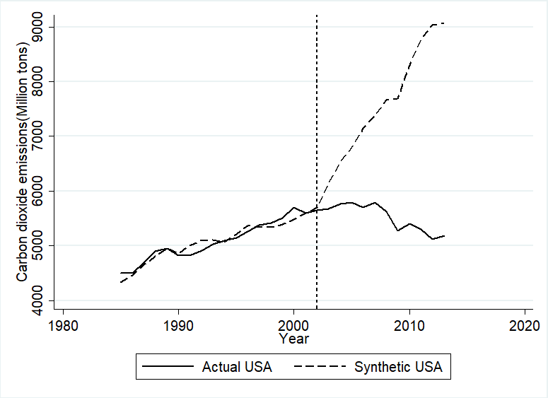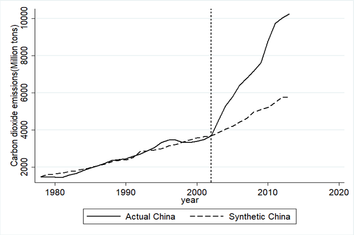 为了探究中国加入世界贸易组织与中国二氧化碳排放以及其他国家二氧化碳排放之间的因果关系,徐晋涛教授采用了碳排放预测模型。因为无法观测到如果中国没有加入世界贸易组织中国及其主要贸易伙伴的二氧化碳排放情况,所以使用综合控制法进行反事实预测,即将研究对象所在地区不同经济发展水平国家集合的二氧化碳排放量加权求和,从而得到与研究对象等体量的二氧化碳排放情况。图4(上)和4(下)分别是中国和美国二氧化碳排放量的实际值与预测值,实线是实际值,虚线是预测值。中国加入世界贸易组织后,中美成为各自最大贸易伙伴,这造成中国碳排放的增加和美国的下降,说明污染天堂效应在中国是存在的。