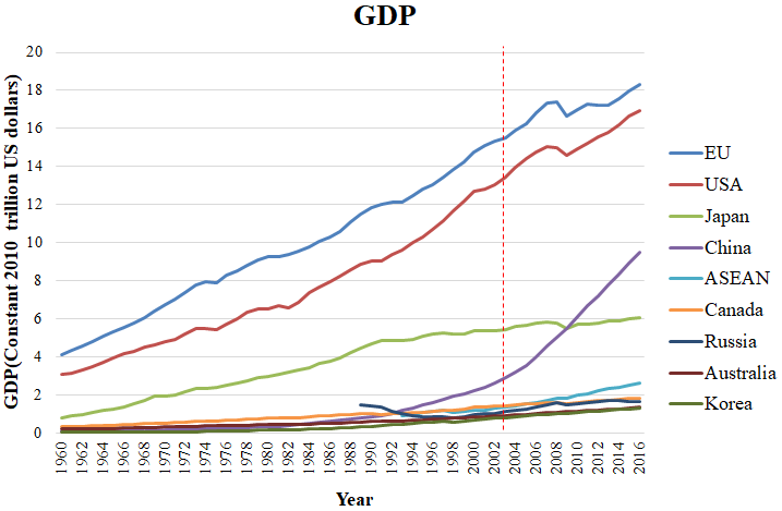 图 3 1960年以来中国与其主要贸易伙伴的GDP(上)和二氧化碳(下)排放情况