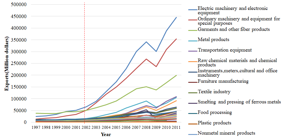 图5 1997年至2011年不同行业出口额(上)与碳足迹水平(下)