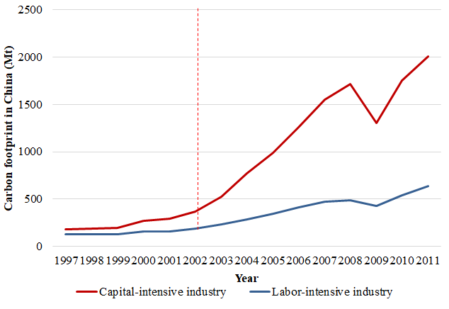接下来,对不同行业二氧化碳排放量与出口额的关系作分析。由图5可知,加入世界贸易组织对中国中等资本密集型行业如电子仪器、中等机械和仪器等的出口有显著推动作用,但这是以二氧化碳排放量的增加为代价的。那为什么资本密集型产业在入世之后的增长远高于劳动密集型产业呢?通过比较两个产业的碳足迹(图6),可以发现资本密集型产业的碳足迹水平明显高于劳动密集型产业,意味着环境要素在中国经济增长中的贡献超过劳动力。