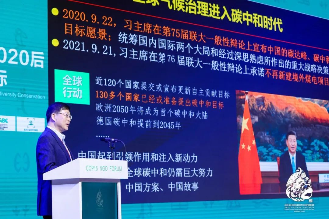 王毅副院长首先发表了主题为“完整准确全面贯彻新发展理念,系统推进生态文明建设,实现生物多样性保护与双碳目标”的演讲。他介绍全球气候治理已经进入碳中和时代,而习近平主席在75届联大一般性辩论上宣布中国的碳达峰、碳中和的目标愿景。2013年,十八届三中全会提建设国家公园及保护地体系,成为生态文明建设中进展最快、成果最显著的综合性改革发展“标杆”,为有效保护生物多样性提供了重要的生态空间。他介绍在新的背景下,可以分别从人和自然的角度更好地推进生态文明建设。国家政府部门其实也很关心碳汇数据、公益保护地体系建设,包括非国家主体可以在生态文明建设中起到的作用等。