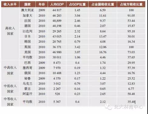房地产税占地方税收收入的比重高低也与地方政府的职能及收入水平密切相关。一般来说,越高的国民收入水平,房地产税占GDP的比重越高,越是地方政府税收的主要来源。如表2显示。