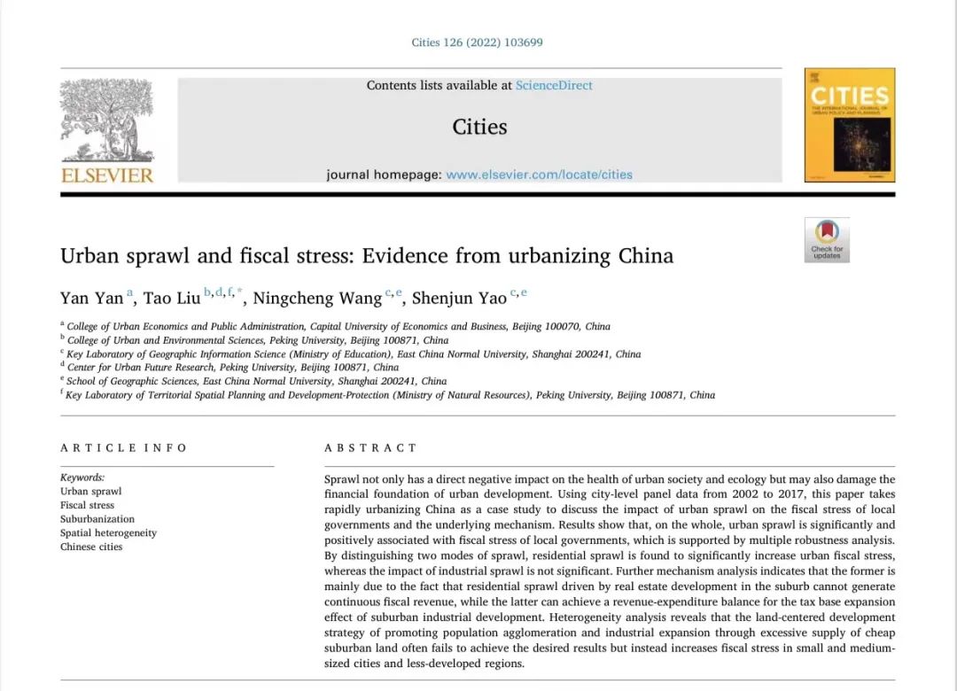 原文出处:Yan, Y., Liu, T., Wang, N., & Yao, S. (2022). Urban sprawl and fiscal stress: Evidence from urbanizing China. Cities, 126, 103699.