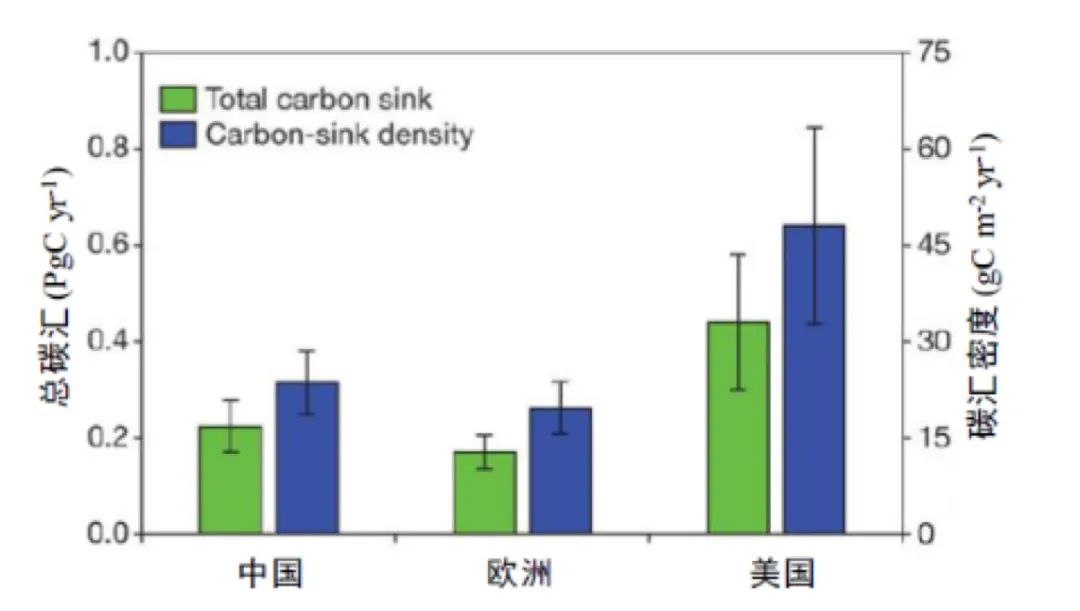 图1 中国、欧洲和美国陆地生态系统碳汇能力