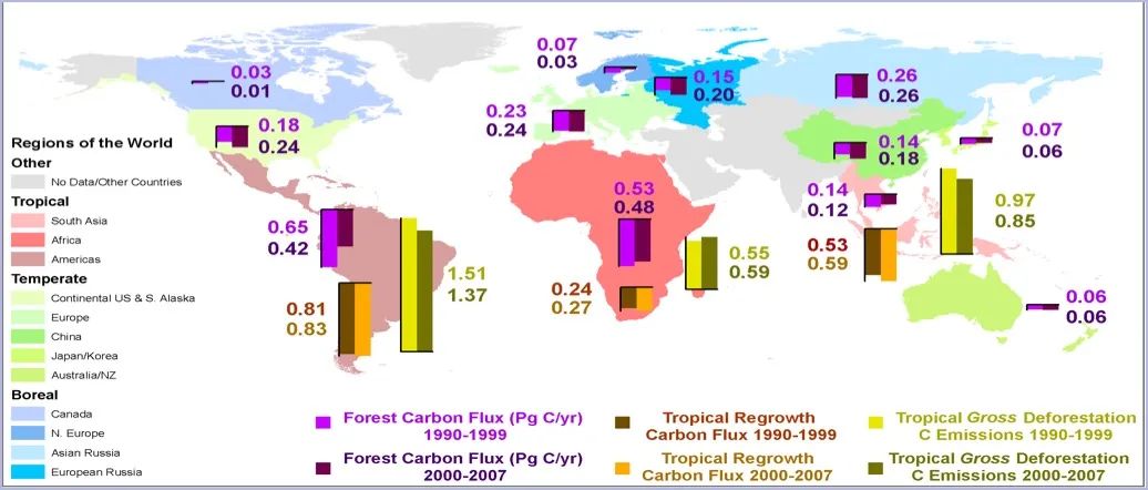 与此同时,方精云教授参与组织和领导的一个国际研究小组还对全球森林生态系统碳源汇进行了综合评估(图4)。研究发现,全球森林总碳汇为4Pg C/a,相当于全球化石燃料排放的一半。热带森林是近中性碳汇,这一结论改变了“热带森林是碳源”的传统观点。