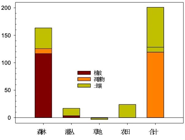 基于中科院碳专项的大规模调查资料,方精云及其团队对中国陆地生态系统碳储量进行了全面清查和系统研究。研究发现,2001至2010年,中国陆地年均碳汇为0.201Pg C,与已有研究数值相当,但抵消同期化石燃料碳排放的比例有所减小,为14.1%。如图2所示,森林生态系统是碳汇主体,贡献了约80%的碳汇,农田和灌丛生态系统各占总碳汇的12%和8%,而草地生态系统则基本处于碳中性或弱碳源状态。