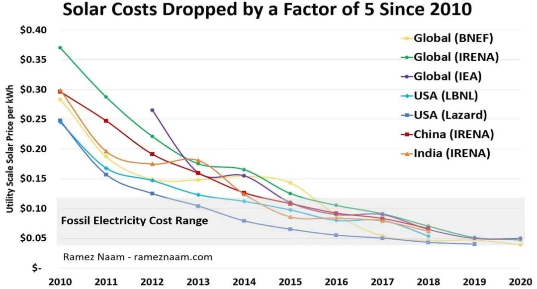 在我们手中已经有一些非常有力的工具,有些工具其实已经存在一段时间了,并且这些工具还都挺便宜的,至少比之前便宜了很多。比如说风能和太阳能,现在的价格是过去的1/5(图3)。化石燃料的替代能源已经存在,这些是资本密集型的。在最开始的时候,需要的投入还是很多的,尤其是对贫困国家来讲。