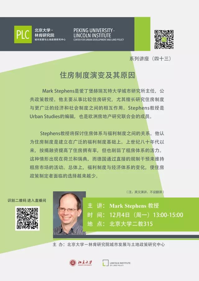 Stephens教授将在讲座中探讨住房体系与福利制度之间的关系。他认为住房制度建立在广泛的福利制度基础上。上世纪八十年代以来,按揭融资提高了住房拥有率,但也削弱了租房体系的活力。这种情形出现在荷兰和瑞典,而德国通过直接的规制干预来维持租房市场的活动。总体上,福利制度与经济体系的变化,使住房政策制定者面临的选择越来越少。