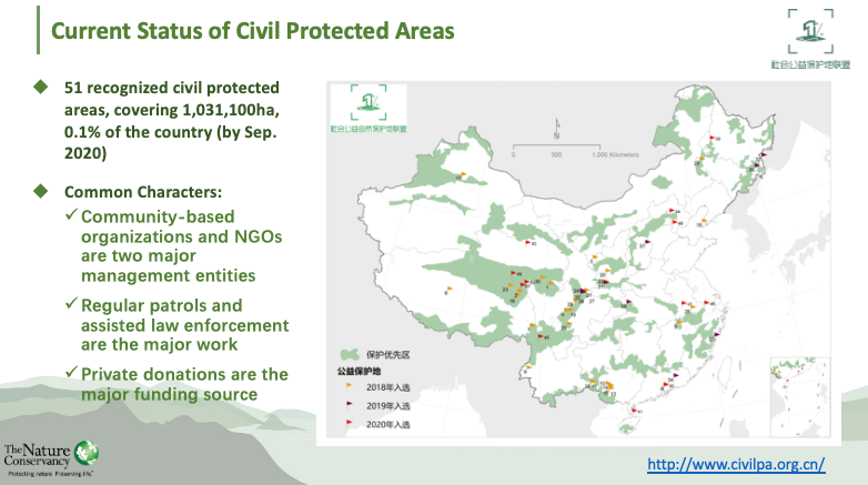 2017年,大自然保护协会中国项目和桃花源基金会等23个非营利组织和基金会在北京发起了社会公益自然保护地联盟(CCLCA,www.civilpa.org.cn),旨在通过民间力量于2030年保护中国国土面积的1% 。同时联盟也在建立平台供成员们分享经验、提供技术支持、制定保护标准并争取获得政策支持和激励。截止2020年底,有51个社会公益自然保护地获得联盟认证,覆盖面积超过一万平方公里,占中国国土面积的0.1%。其中2/3为社区保护地,另外8个为非营利组织管理,还有9个是非营利组织和政府部门或社区委员会共同管理。这些保护地都展开了定期巡护和协助执法等保护工作。目前,社会公益自然保护地的资金来源仍以公益捐赠为主,阿里巴巴的蚂蚁森林为其中不少公益保护地提供了资金支持,并通过蚂蚁森林保护地的平台发挥公众连接和互动功能。