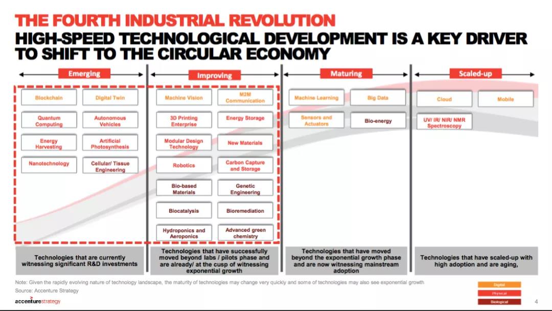 第四次工业革命改变了循环经济。同样也改变了社区和社会。首先要充分发挥第四次工业革命的潜力,技术可以用于许多不同的地方和不同的目的。循环经济可以提高利用资源的效率,如使用AI提高对公路、水、小型基础设定等的使用效率。此外还有“以人为本”的创新,如有“人类增强”的遥感器、视觉系统和共享城市、平台城市等。