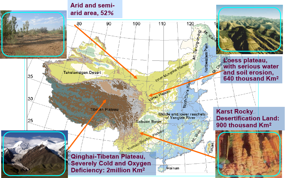 中国的生态系统与景观具有多样性的特征,区域之间自然条件的差异非常大。同时,中国人口和资源的分布呈现高度不均衡的格局。例如,中国64%的可耕地位于华北地区,但是在华北地区只有18%的水资源,82%的水资源都分布于长江以南。现在中国有14-15亿人口,西部13省土地占72%,但是人口只有29%。我国的生态系统面临着一系列问题,一方面包括沙尘暴、水土流失、土地沙漠化等一系列环境问题,另一方面面临快速城市化等问题。现在城市化率是57%,在快速的经济增长需求下,城市化率会进一步提高,大量的自然资源等待开发。因此生态修复与管理工作具有重要意义。