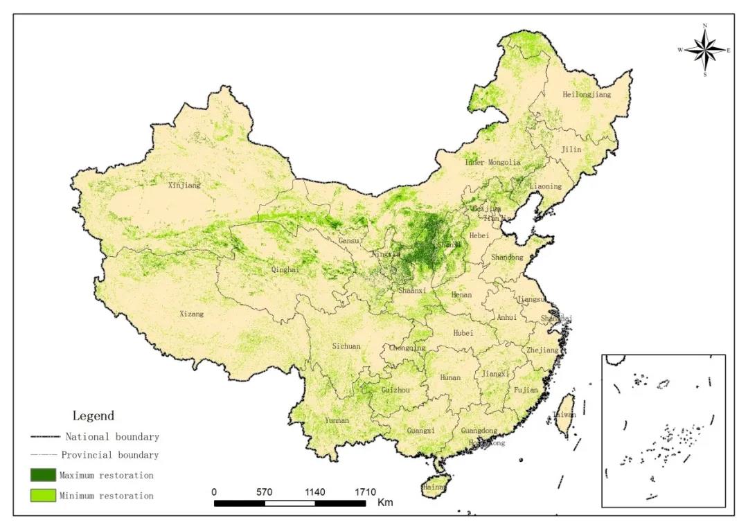 相关研究显示,中国政府在1998年至2015年期间,对于生态修复工作的投资不断增大。同时在过去的20年间,植被的修复和恢复程度不断上升。现今,黄土高原的绿化程度大大提升,北京的沙尘暴天气频率显著降低,土壤流失和土壤侵蚀的情况有所缓解。在国家的层面上,2000-2010年间土壤侵蚀的面积减少了5.6%,土地沙漠化的面积下降了6%,土地石漠化的面积下降了4.7%。这得益于从生态的角度对草地和农田等地区进行的修复和控制。此外,哈佛大学团队以及傅教授团队的研究指出,中国在土地绿化方面的工作走在了世界前列。2000-2010年间,全国广泛推行的退耕还林、天然林保护、退耕还草等项目大大增加了碳汇,促进了对土壤的保护,有利于对风沙的预防和水土的保持。