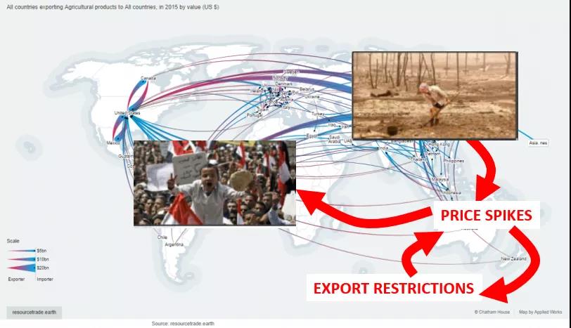 相反,我们看一下全球的食品贸易的发展。在过去的一段时间里,它逐渐变得不够冗余了。就像航线的演进一样,人们移除了更多的冗余,希望能够提高它的效率。当前,人类依靠少数几个主要的食品出口地向世界其他地方出口。这是比较高效的一个方式,但也是一种比较冒险的方式。由于很多国家和城市都非常依赖于这么几个粮食出口中心,一旦出口中心出现了问题,就会带来巨大的扰动。比如说在2011年,某些粮食生产中心遭遇到了干旱,粮食的产出大大下降,于是就造成了粮食价格的飞涨,进而波及到了全球的城市,带来了一些粮食的冲突和不稳定,也带来了非常巨大的地缘政治方面的后果,尤其是在“阿拉伯之春”之后。