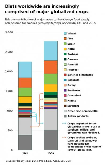 我们再来思考一下,养活城市人口的粮食和食品的多样性在降低。人类的菜篮子更加缺乏多样性了。基本上有三个大的作物,就是小麦、稻米以及玉米,大概占据了卡路里的50%。现在我们生活在一个全球化的世界里,城市里边很多的膳食同质化了,集中在少数的食品或者是品种上面。当然了,从效率的角度来讲是有好处的,但是却有一个危险,那就是丧失了选择。有一篇论文谈到了杂粮或者孤儿作物,就是量比较少的杂粮。它们非常适应当地的气候,并且营养元素也非常高,但是它们的消费规模是下降的。这使得我们城市人口的粮食选择减少了。现在,有成千上万的本地作物,这些作物能够给我们繁殖出更多新的且在气候变化中有更高的适应性的品种。
