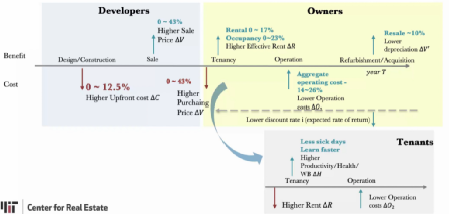 具体而言,模型从需求和供给两方面进行构建。在需求侧,模型考虑了租客、运营商和开发商三类主体的利益,使其均能从建筑电气化供暖中获得与成比例的收益(图2)。首先,从租客角度,宜居的生活环境以及较低的能耗将提升租客的生活体验,使其愿意支付更高租金。其次,从运营商角度,更高的租金和更低的能耗使运营商在后期转卖时能获得更高价格,进而使其具有更高意愿来买入资产。最后,从开发商角度,更高的出售溢价以及更低设备成本使开发商获得更高收益,进而提升其开发意愿。然而,当需求侧无法发挥作用时,管制性政策和资本市场的资金导入将从供给侧渠道引导绿色建筑的发展。比如,在政策角度,纽约市规定,所有超过25000平方米的建筑需要达到碳减排标准,否则将导致罚款。