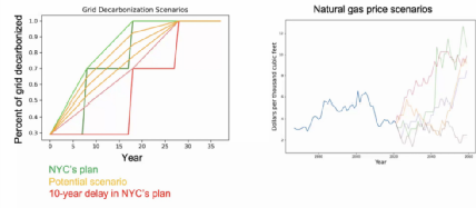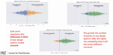 郑思齐教授讨论了其团队当前在纽约做的尝试。他们通过模型测算了传统燃气供暖、电气供暖以及灵活型供暖(即燃气和电气混用)三类方案,并发现,无论在什么样的不确定性下,灵活型供暖方案的收益与成本都更占优(图4)。因此,郑思齐教授指出,在不确定性风险背景下,建筑的电气化供暖改造需要以更加灵活的方式进行。
