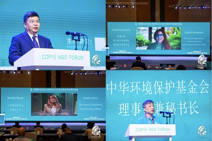 随后,中国生态环境部副部长赵英民先生(由中华环保基金会理事长兼秘书长徐光代致辞)、生态环境部COP15谈判代表、执委办执行副主任刘宁、CBD秘书处执行秘书特别顾问兼高级项目管理官员Catalina Santamaria女士以及大自然保护协会全球CEO Jennifer Morris女士为闭幕式致辞。他们对非国家主体,尤其是中国NGO在生物多样性保护方面做出的努力表示了高度赞扬,对本次平行论坛的成功举办表示祝贺,并与所有参会嘉宾共同见证了接下来的非国家主体自主贡献倡议仪式。
