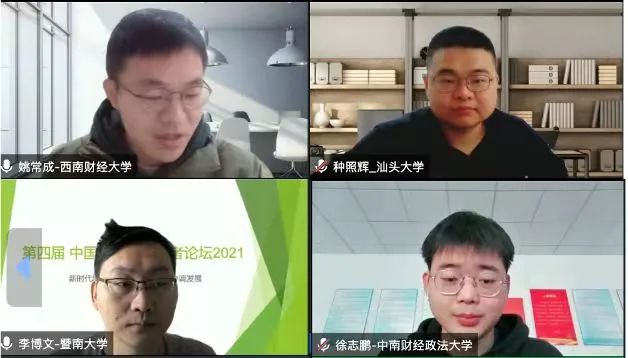 分会场三以“房地产与土地市场研究”为主题。上午场主持人为汤玉刚教授,汤玉刚、黄娜群、龚金金、黄永斌和沈淑琳老师分别就租税替代与商住用地价格差、疫情与城市住房市场、城市住房价格动态联系及其影响因素、基础教育集团化与学区房价格、本地住房市场情绪回报等议题进行了报告与讨论。