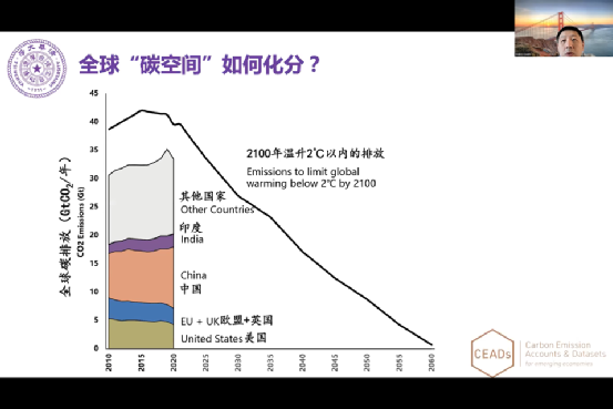 清华大学气候变化经济学特聘教授关大博教授介绍了其所在课题组建设的中国碳核算数据库(CEADs),这是一套具有自主知识产权、可比较、可验证、全透明、全免费、聚焦全球发展中经济体的碳核算数据库。构建“自顶向下”降尺度清单与“自底向上”排放点源大数据相验证耦合的碳排放清单大数据核算方法体系,通过将自顶向下的国家统计及宏观层面数据与自底向上的微观层面点源级和实测数据有机衔接,实现国家、区域、城市层面,多尺度统一、全口径、可验证的高空间精度、分社会经济部门、分能源品种品质的精细化碳排放核算。典型数据例如中国长时间序列碳排放数据集,细分17种化石燃料、47个行业部门、10余种工业产品过程排放数据集;新兴经济体碳排放-社会经济耦合数据模式,构建全球所有245个国家/地区,135个行业部门,连续时间序列的全球社会经济贸易模型。随后关教授展示了基于相关数据完成的全球新兴经济体、全球中小型发展中经济体二氧化碳排放年度报告,并介绍了国际社会应对气候变化的进程,中国碳中和、碳达峰的内涵及路径。