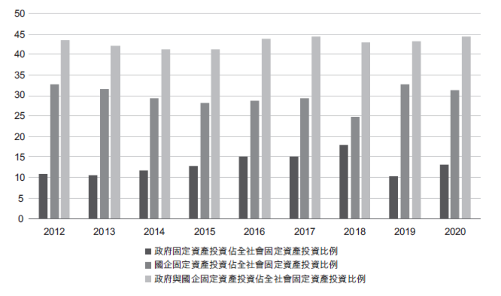 从统计数字上看,“投资驱动经济”的结果是显著的。2000至2020年,中国全社会固定资产投资占GDP的比例在世界各国中居于最高位置(见图1);尤其自2009年以来,该指标高达40%以上,明显高于也处在高位的印度和韩国,更远远高于世界平均水平(大约25%)。2012至2020年的数据表明,中国固定资产投资中政府和国企的投资份额之和占40%以上(见图2),其中政府投资占固定资产投资比例为10至17%,相当于占GDP的4.2%至7.1%。相比之下,2021年经济合作暨发展组织(OECD)国家政府投资占GDP的比例平均为3.4% [12]。需要说明的是,除了“投资驱动经济”政策之外,还有如下原因导致上述趋势,包括中国经济快速增长带来的投资需求、国内消费占GDP比例长期偏低,以及净出口占GDP比例逐步走低等。